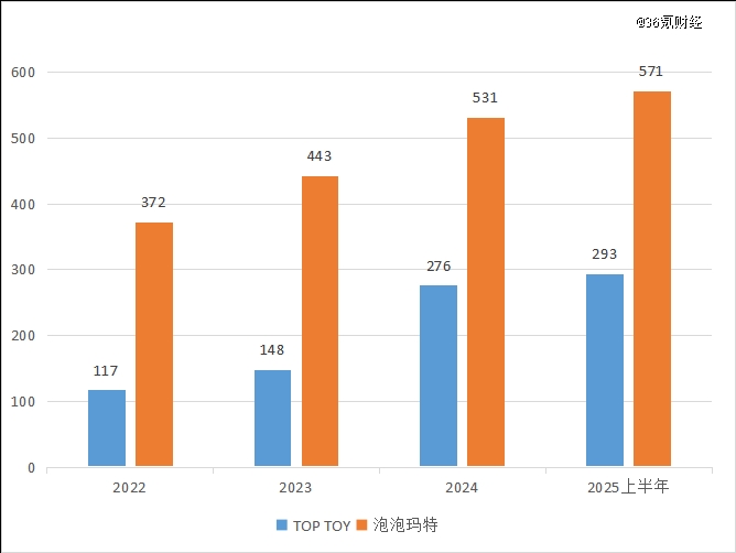 图:2022年-2025年上半年TOP TOY与泡泡玛特门店数目比较(含海外市集);数据起源:企业财报,36氪