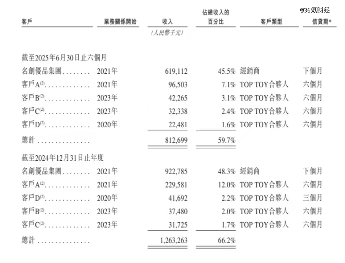 经销商则须要继承库存,即TOP TOY把产物卖给经销商,再由经销商卖给顾客,以是TOP TOY正在经销渠道赚取的是供应链收入。母公司名创优品是其最 大的经销商,招股书显示,2024年和2025年上半年,TOP TOY通过卖货给名创优品所告终的营收差别为9.23亿元和6.19亿元,占同期总收入的48.3%和45.5%。