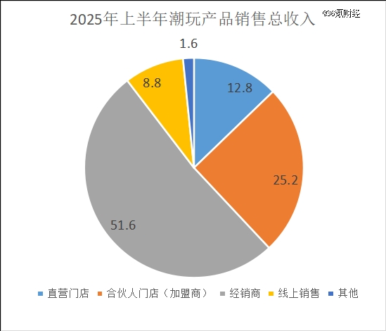 从营收构造来看,潮玩产物贩卖是其重心交易,截至2025年上半年,该交易的收入占比约97%。从渠道维度来看,经销商同期收入占比最高,亲热50%;加盟商、直营门店、其他渠道则的占比递次递减。