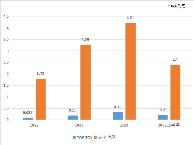 图:2022-2025年上半年名创优品与TOP TOY授权用度比较(单元:亿元);材料起源:公司财报,36氪