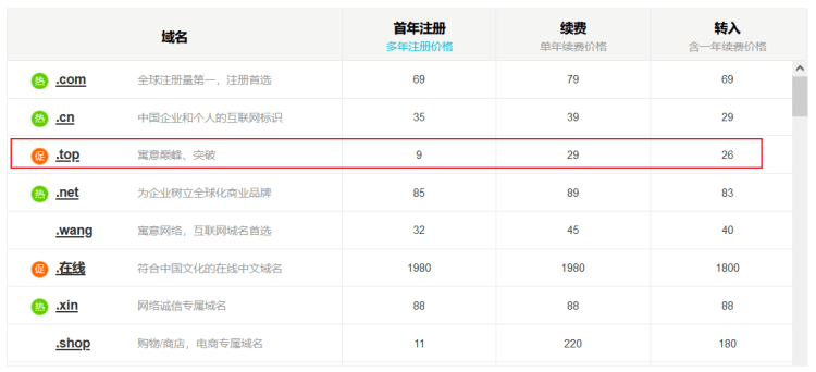 咱们可能看到名新注册和续费价值和咱们老例的名差不众,与其差不众咱们实在仍是偏向于注册.CN的。固然COM域名目前要70众元,可是事实是邦际老牌通用域名。片面网站用域名,我片面不是太笃爱.TOP域名,咱们看到的这类网站的片面网站大概也不众。