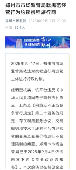9月18日,公民日报公家号转发郑州市监约道携程的讯息,直指其“愚弄效劳和道、营业正派和手艺妙技,对平台内策划者的营业及价值实行分歧理束缚”,央求期限整改。
