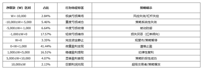 Followme用户的净取款举动(W = 存款 − 取款)外露出高度组织化的特质,反响了区别类型营业者正在盈亏状况下的心情反响和政策举动: