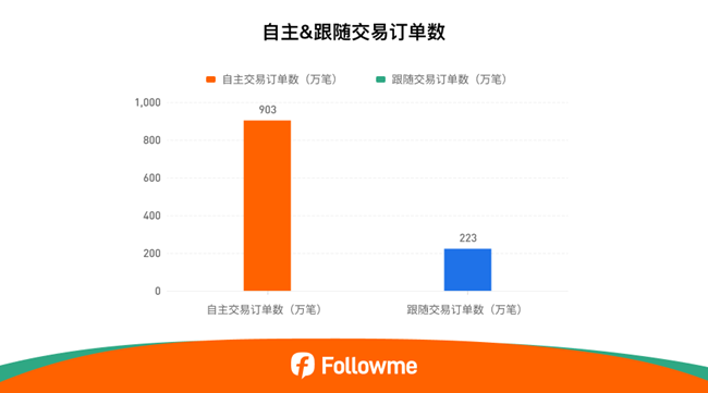 2025年上半年,Followme 营业社区总共 MT4 账户累计营业 15,246,746 笔订单,均匀每个营业日竣事 120,053 笔订单。个中,自决营业订单数与扈从营业订单数之比为 4:1。