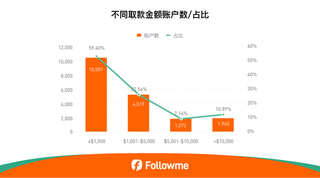 从账户组织来看,小额资金账户(≤$1,000)仍然是平台用户的主力,占比领先对折。然而这类账户资金容量有限,危急经受技能弱,极易因营业耗损进入“无法有用提款”的窘境,是榜样的“被动资金留存”群体。