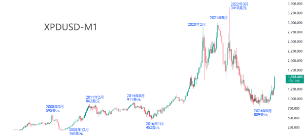 2022年3月至2024年8月,钯金代价从最高点继续暴跌,最低跌至809美元,累计最大跌幅76%,恐惧墟市。因为钯金代价过高,创设商采取同期间代价更低廉的钯金动作催化转化器的紧要原料,这导致钯金的需求大降。其余,汽车墟市从燃油车向新能源车的转换,也衰弱了钯金的需求面。各类要素协同感化,促成了钯金代价正在2022年至2024年的大跌。