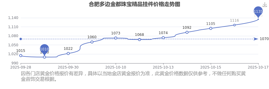 今日(2025年10月19日)合肥众边金都珠宝精品挂件代价为1135.0元/克。