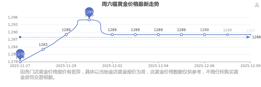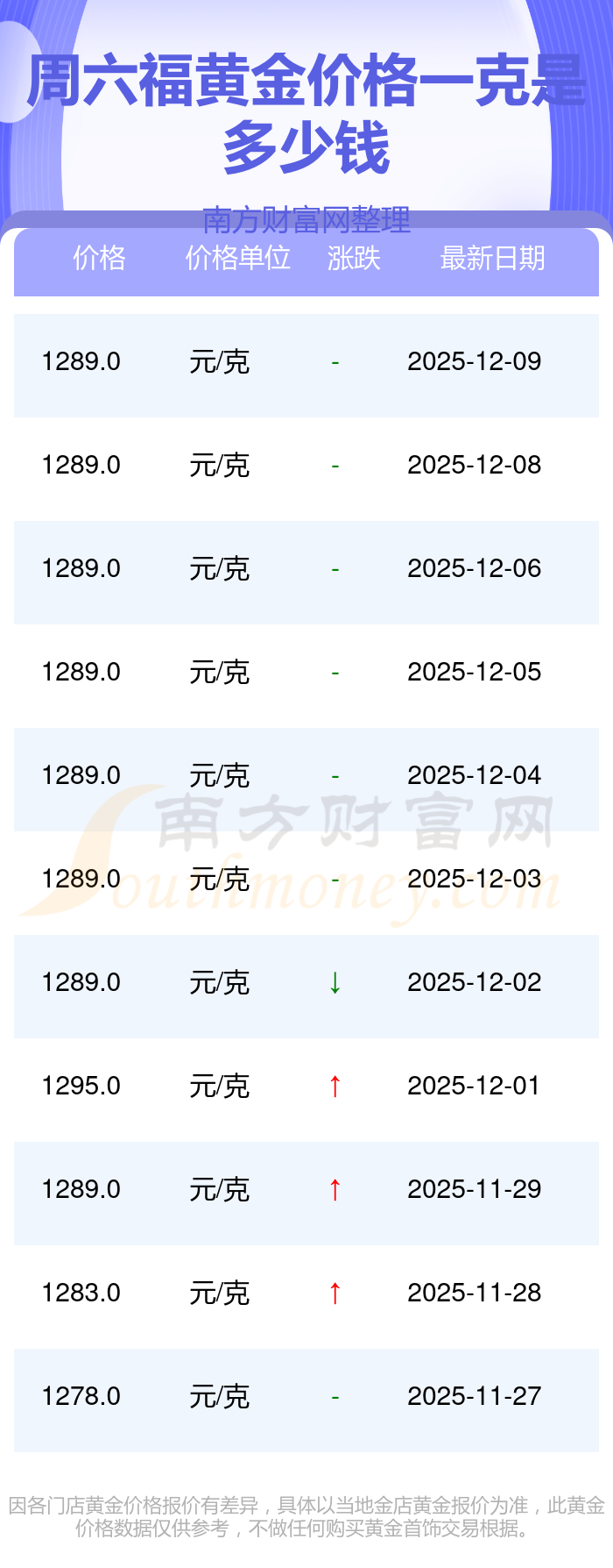 今日黄金价值最新盘查_各大金店黄金价值众少钱一克, 一道来看看吧! 2025年12月9日周大福、周大福、周大福、周大福、周大福、周大福、周大福、周六福、周六福、周六福、周六福等各大金店品牌黄金价值最新价值如下:周大福黄金价值1328.0元/克,周大福铂金价