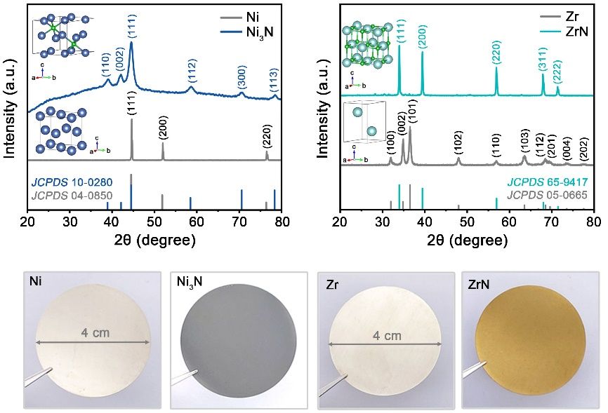 过渡金属氮化物具有导电性优异、电化学安祥性好以及耐侵蚀性强等特质,希望计划高活性、高安祥性AEMFC电催化剂。守旧法子制备过渡金属氮化物是操纵侵蚀性强的氨气行动氮源,普通会带来情况污染;并且,因为需求操纵较高的合成温度,会导致资料烧结,省略催化活性位点。该探究组借助等离子体巩固化学气相浸积来将氮气离子化,有用使得惰性的氮气插手反响,制备了高质料的Ni3N和ZrN催化剂。这种法子具有很好的拓展性,可正在各自的金属箔上制备晶片级的Ni3N和ZrN层,出现出很好的运用前景 (图2)。