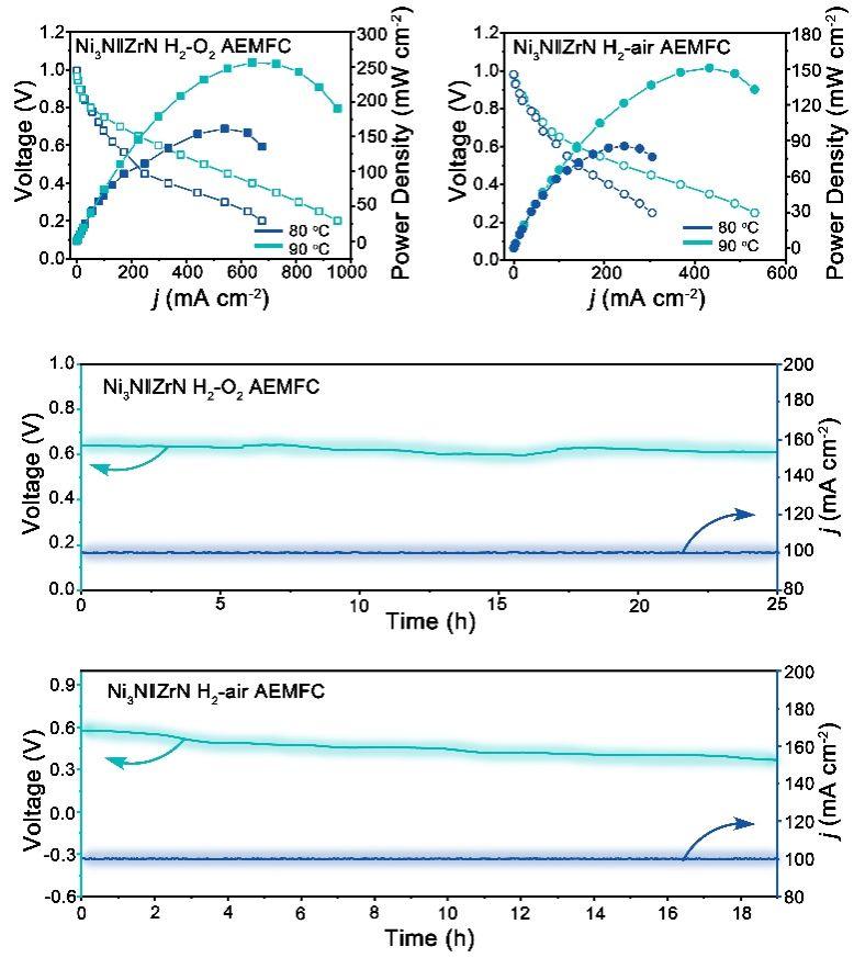 探究职员行使扭转圆盘电极体例评估了Ni3N和ZrN正在碱性电解质下氢气氧化(HOR)和氧气还原(ORR)机能。结果剖明,Ni3N和ZrN永诀出现了优异的HOR活性和ORR活性,靠拢贵金属Pt/C催化剂,而且尽头安祥。基于此发掘,探究职员将Ni3N和ZrN永诀用作阳极和阴极催化剂拼装到AEMFC中,正在氢气-氧气和氢气-气氛下永诀取得256 mW cm-2和151 mW cm-2的功率密度,并也许安祥的职责25个小机会能不衰减 (图3)。这是目前齐全非贵金属催化剂驱动的AEMFCs所报道的最佳值之一。
