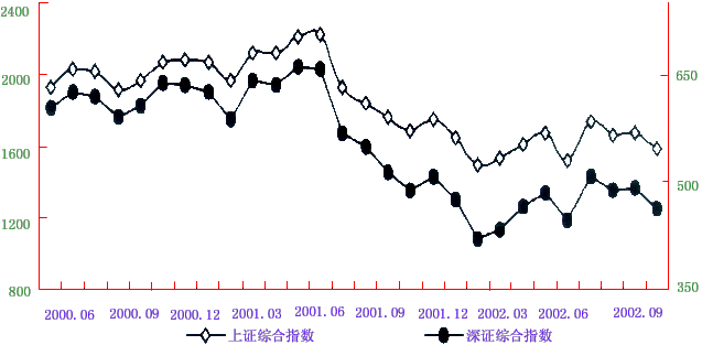 受客岁股市大幅回调的影响,本年前3个季度墟市成交平常。本年前3个季度,沪、深股市累计成交23270亿元,同比省略8912亿元;日均成交132亿元,同比省略48亿元,降低26.7%,墟市成交同比萎缩较众。个中A股累计成交22531亿元,同比省略4975亿元;日均成交128亿元,同比省略26亿元,降低16.9%,第三季度,沪、深两市股票共成交6425亿元,日均成交99亿元,日均成交比上季省略50亿元,比客岁同期省略14亿元。 2002年9月末,上证归纳指数以1582点报收, 比二季度跌151点,比客岁末跌64点;深证综指以463点报收,比上季跌44点,比客岁末跌13点。