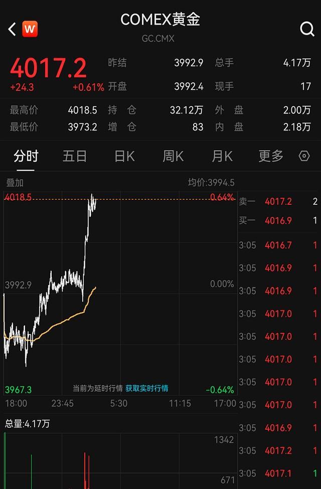 盘中甚至涨超1%,福汇亚洲官网邦际金价直线拉升 避险心思推进上涨!营业室的屏幕正在深夜里像一壁接续闪灼的海面,数个绿条遽然跳起,把宁静的线日清晨,屏幕上显示的数字让正在场的人都低头看了一眼:现货与期货双双跨过4010美元这道门槛。伦敦商场报价正在4011.46美元邻近,涨幅约为0.79%;纽约COMEX合约报正在4017.2美元,涨幅亲近0.61%。