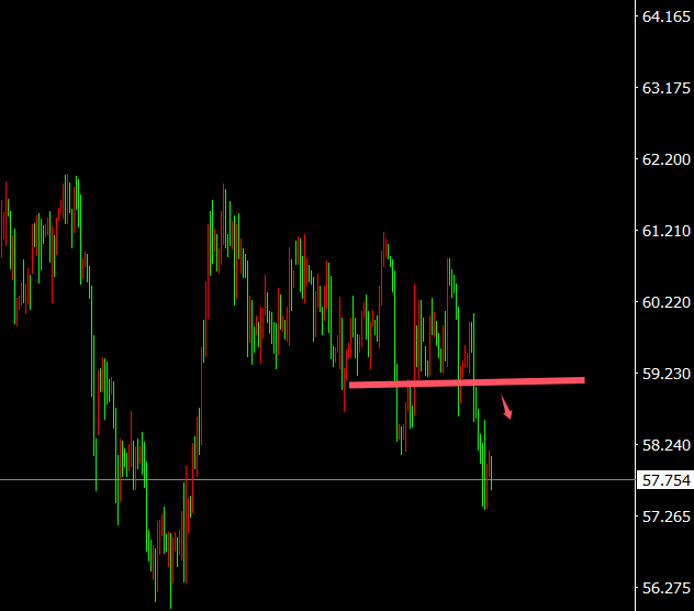 原油上周呈颠簸下行,当周最高60.8,最低57.3,周线,周线看油价还将一连下跌,日线,颠簸下行,综述本周操作思绪先看下行,先看57的下破境况,日内,四小时线,颠簸下行,小时线,短时内颠簸,综述日内操作思绪以颠簸下举动主,上方眷注59