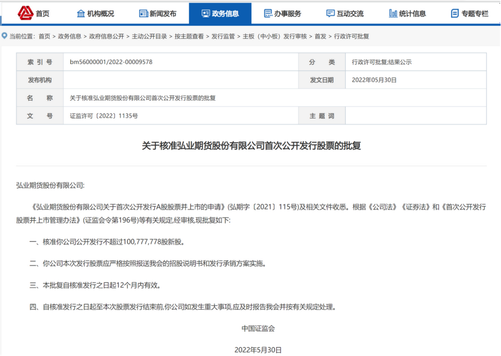与此同时,证监会官网也披露5月30日闭于照准弘业期货初度公然采行股票的批复,照准弘业期货公然采行不跨越100777778股新股。本次发行股票应厉酷服从报送证监会的招股仿单和发行承销计划实行。