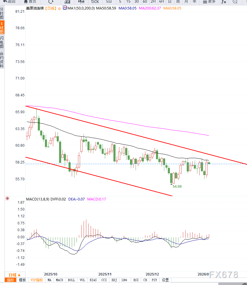 周五亚盘时段美原油小幅回落,亲切辘集压力区间,短期交投于58美元/桶邻近。