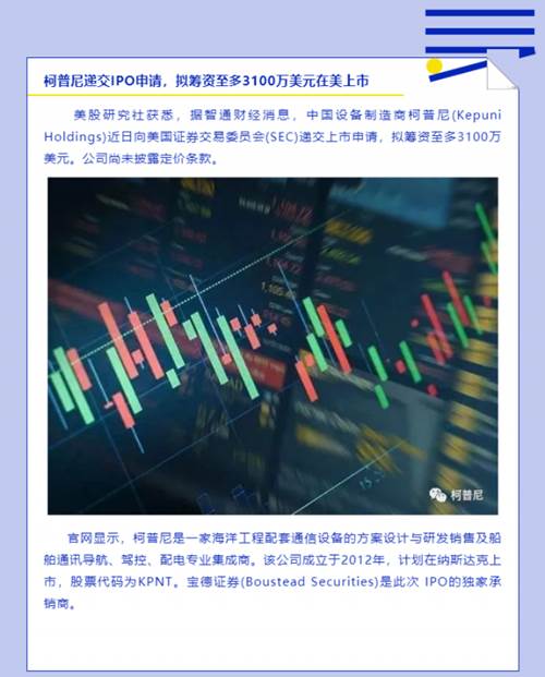 外地光阴2021年8月31日,中邦帆海通信和电子设置缔制商柯普尼控股公司(KepuniHoldingsInc.,以下简称:柯普尼)正式向美邦证券业务委员会(SEC)提交了申请,该公司拟以KPNT为股票代码,申请正在纳斯达克上市。柯普尼公司董事长崔小飞展现,为企业发达插上了起飞的羽翼,将进一步深化自立改进,加大研发参加,一直擢升产物逐鹿力和市集占领率,加疾发展为正在邦际邦内具有较高着名度、正在同行业具有较强影响力的企业。